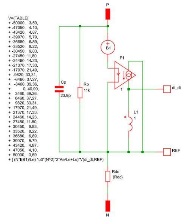 飽和效應(yīng)(感值隨著不同工作電流變化)的建模是根據(jù)查找表和磁性設(shè)計(jì)標(biāo)準(zhǔn)公式:(1) L = μ0 μr ( Ae/Le) N²,(2) H = (N × I)/Le ,(3) 查找表μr = f(H),(4) VL = L × dI/dt,B1為電感電壓。L和dI/dt分別由(1)號(hào)公式和(4)號(hào)公式根據(jù)測試電感L1 (1H)推導(dǎo)得到。F1是一個(gè)電流驅(qū)動(dòng)的電流源,1:1匝數(shù)比,輸出等于電感模型測量值。因?yàn)長1 = 1H,所以dI/dt = V (dI_dt-REF) 。F1對(duì)電感模型沒有任何影響,僅在計(jì)算每個(gè)點(diǎn)的VL、PFC的系統(tǒng)中,用于推導(dǎo)dI/dt。L (B1、F1和L1)、Cp和Rp模擬了電感的自諧振特性。