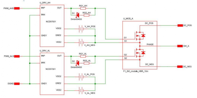 功率部分是整個(gè)功率變換的重點(diǎn),也是仿真模型的關(guān)鍵。它包含了3個(gè)半橋SiC模塊和柵極驅(qū)動(dòng)。驅(qū)動(dòng)系統(tǒng)對(duì)整體性能的影響相當(dāng)顯著(對(duì)基于SiC的系統(tǒng)影響更大),所以我們強(qiáng)烈建議將其加入整體仿真,哪怕只囊括部分。然而目前的問題是已有的柵極驅(qū)動(dòng)器的模型為了適應(yīng)更多常見往往設(shè)計(jì)得較為復(fù)雜。一般而言,對(duì)系統(tǒng)級(jí)的模擬,或者說對(duì)本次項(xiàng)目的模擬,一個(gè)簡化的驅(qū)動(dòng)模型就已經(jīng)足夠了。