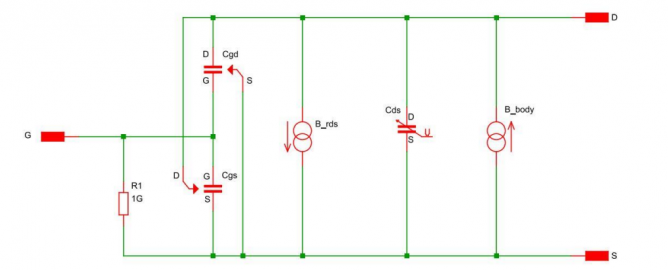 SIC MOSFET的RDS(ON)很大程度上取決于柵極電壓VGS,其特性包含于“B_rds”的模型中。雖然VGS對(duì)RDS(ON)的影響很大,但它也會(huì)一定程度上隨瞬時(shí)ID和VDS變化,不過在本次仿真中,不考慮這個(gè)特性帶來的影響。