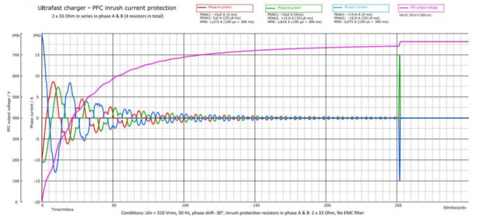 圖13和圖14展示了我們的系統(tǒng)在最差情況下的結(jié)果:母線相-零電壓為310 Vrms,A相從0點(diǎn)偏移了-30°,450 μF的輸出電容完全被耗盡。仿真告訴我們重復(fù)啟動(dòng)應(yīng)該設(shè)置一個(gè)4.19秒的冷卻時(shí)間以確保7 W的損耗要求(抗浪涌電阻的功耗)。然而,一般來說充電系統(tǒng)不會(huì)在短時(shí)間內(nèi)重復(fù)啟動(dòng)(幾秒內(nèi))。