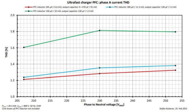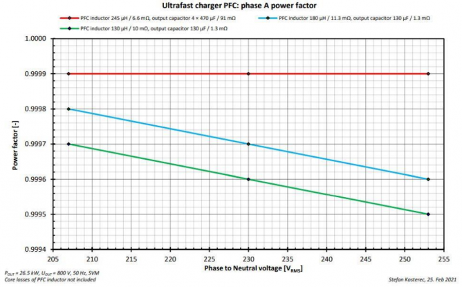 圖15. 功率因數(shù)和輸入電壓值、感值和輸出容值的關(guān)系。所有情況的功率因數(shù)均>0.99。