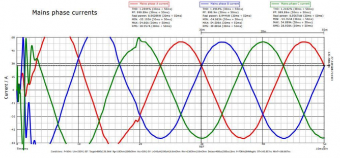 可以確定地是電流越大,系統(tǒng)損耗越大??傊C波失真(THD)結(jié)果也體現(xiàn)了這一點(diǎn)(圖19)。