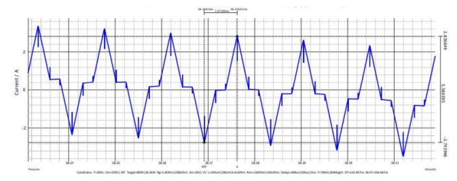 我們還可以看到實(shí)際的紋波電流曲線和頻率的形狀在同一個(gè)點(diǎn)是有差別的。這樣的情況在SVM里比較常見且并不會(huì)造成問題。(我們不會(huì)在本文對(duì)這一內(nèi)容進(jìn)行深入討論,但它與CCM和DCM中的變換過程有關(guān)。)