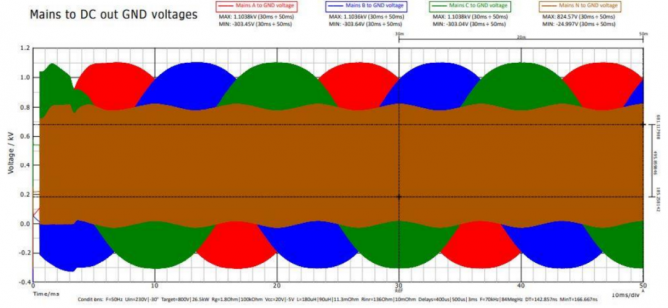 有趣的是,零線/地線到直流輸出GND電壓的包絡(luò)被三倍的電網(wǎng)頻率影響,調(diào)制深度與PFC電感的飽和度有關(guān)(圖25)。這些現(xiàn)象受到PWM調(diào)制策略的影響,在我們的案例中,對(duì)應(yīng)于在SVPWM系統(tǒng)中看到的包絡(luò)。