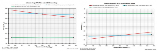 圖25是輸入和直流負(fù)輸出(-VDC)的電壓包絡(luò),以及零線或地線與直流負(fù)輸出的壓差。圖26和圖27表現(xiàn)了電壓從-300 V提高至+1100 V的過程。我們需要至少在設(shè)計(jì)電感和PCB時(shí)考慮到這些電壓等級(jí)。如此高的電壓可能會(huì)造成PCB上器件和電感的隔離問題。除此之外,零線/地線與直流負(fù)輸出之間的高壓和dV/dt會(huì)帶來不同性質(zhì)的噪聲,尤其是連入PFC輸出的系統(tǒng)會(huì)特別容易受到共模噪聲的影響。