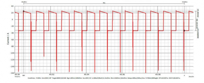 結(jié)果:ICAPACITOR,PEAK-PEAK=58 A,ICAPACITOR,PEAK=25 A,ICAPACITOR,RMS=24.78 A。X軸:10 μs/div。