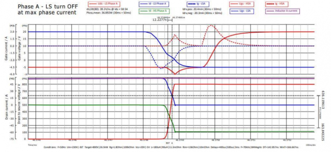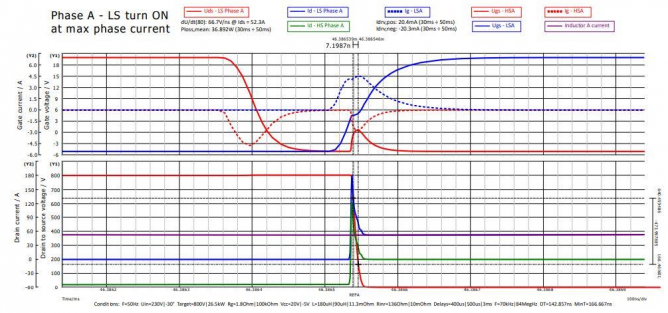 圖32顯示在本模擬中給出的配置下,dV/dt值超過了66 V/ns,唯獨(dú)寬禁帶技術(shù)才能對(duì)應(yīng)這樣的高速開關(guān)。實(shí)際上,如此高的dV/dt仍然會(huì)有高風(fēng)險(xiǎn)(即使是SiC模塊),寄生電感產(chǎn)生的超高過壓尖峰可以輕易的超過器件的耐壓上限。