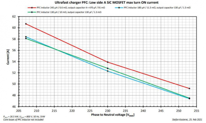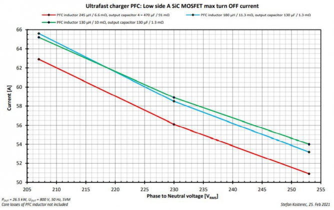 有關(guān)功率模塊的損耗,仿真帶來了有趣的信息(圖11)。模塊的損耗僅和感值相關(guān)。原因應(yīng)該是更低的感值會(huì)帶來更大的紋波電流,紋波電流越大,導(dǎo)通電流越低,所以開關(guān)損耗也降低了。
