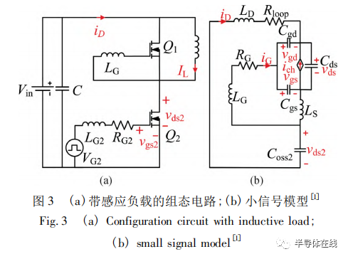 1. 1 開關(guān)振蕩產(chǎn)生的原因 根據(jù) Chen 等 分析,引起開關(guān)振蕩的主要原因如下: ( 1) 柵源電壓的誤開啟觸發(fā)振蕩。寬禁帶半導(dǎo)體器件的誤開啟主要是由高 dv/dt 和 di /dt 引起的,圖 2展示了柵極開啟和關(guān)斷誤觸發(fā)的影響。開啟時(shí),頂部 Q1 柵源電壓在 Q2 開啟過(guò)程中逐漸增大,由于開關(guān)速度快,位移電流通過(guò)米勒電容 Cgd1被 dv/dt 誘導(dǎo)流向柵極結(jié)點(diǎn),導(dǎo)致高柵源電壓 Vgs1。同時(shí)高 di /dt 在共源電感 Ls1上產(chǎn)生負(fù)電壓,產(chǎn)生誤觸發(fā); 關(guān)斷時(shí),Q2關(guān)閉過(guò)程中,由于高 dv/dt 通過(guò) Cgd2產(chǎn)生電壓,其產(chǎn)生的電流通過(guò) LG2產(chǎn)生電壓,柵源電壓超過(guò)閾值導(dǎo)致誤導(dǎo)通。 ( 2) 源漏極電壓持續(xù)振蕩。由于氮化鎵器件沒有體二極管,當(dāng)柵源或柵漏電壓大于器件閾值電壓時(shí),電子被吸引到 AlGaN/GaN 異質(zhì)結(jié)表面,2DEG 重建,產(chǎn)生反向電流。圖 3 為帶感應(yīng)負(fù)載的組態(tài)電路及其小信號(hào)模型,當(dāng)有源開關(guān) Q2關(guān)閉時(shí),負(fù)載電感電流 IL從源極流向漏極,可能導(dǎo)致柵漏電壓超過(guò)閾值電壓,此時(shí)由于氮化鎵器件的寄生參數(shù)及反向?qū)щ娞匦?,可能?huì)發(fā)生持續(xù)振蕩。當(dāng) Q2柵源電壓正常時(shí),則只考慮輸出電容Coss2,當(dāng)反饋系統(tǒng)滿足巴克豪森穩(wěn)定性判據(jù)時(shí),系統(tǒng)將出現(xiàn)持續(xù)振蕩。
