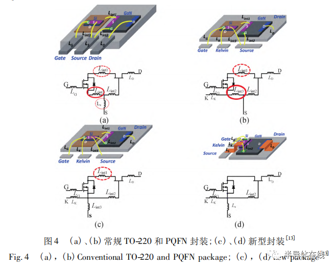 1. 2 抑制開關(guān)振蕩的方法 柵極上的電壓振蕩主要由寄生電感引起,所以降低寄生電感是抑制振蕩的主要方法。 Liu 提出了一種 PQFN PLUS 和 GaN HEMT 垂直低壓 Si 功率 MOSFET 的疊模封裝,如圖4 ( a) 、( b)為常規(guī)的 TO-220 和 PQFN 封裝,( c) 、( d) 為新型封裝。如圖 4( a) 中 TO-220 封裝存在三種共源電感 Lint1、Lint3和 LS,PQFN 貼片封裝的形式由于開爾文連接提供了單獨(dú)的驅(qū)動(dòng)回路,消除了 LS只能影響到 Si MOSFET,對(duì) GaN HEMT 的影響有限。文中設(shè)計(jì)的 PQFN PLUS 主要區(qū)別在于重新定向了鍵合線 Lint2,這樣 Lint3被排除在 HEMT 驅(qū)動(dòng)回路之外,同時(shí)通過(guò)開爾文連接也被排除在 MOSFET 驅(qū)動(dòng)回路之外,不再是共源電感。如圖 4( d) 所示,文中所設(shè)計(jì)的 stack-die 封裝中,將 MOSFET 的漏極直接安裝在 HEMT 的源極頂部,使用這種疊層封裝進(jìn)一步消除了 Lint1。所以采用這種 stack-die 疊層封裝可以消除所有共源電感,對(duì) HEMT 的封裝起到了優(yōu)化作用。對(duì)比 PQFN 封裝,降低了硬開關(guān)的開關(guān)損耗,提升了開關(guān)速度,開關(guān)關(guān)閉時(shí)寄生振鈴減小。