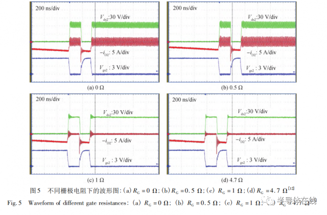 上述方法雖能有效降低共源電感,但疊層封裝增大了封裝體的厚度,相對(duì)來(lái)說(shuō)體積更大,封裝難度更高。 Wang 等列舉了三種常規(guī)解決開關(guān)振蕩的方法,除了如上所述的減小共源電感外,還提到了增加?xùn)艠O電阻來(lái)抑制振蕩。如圖 5 所示,驅(qū)動(dòng)電壓為 60 V,柵極電阻分別為 0 Ω、0. 5 Ω、1 Ω 和 4. 7 Ω。隨著柵極電阻的增大,振蕩頻率也逐漸減小。在漏源極之間并聯(lián)一個(gè) SiC 二極管,二極管的結(jié)電容導(dǎo)致 Cds增加,從而達(dá)到抑制開關(guān)振蕩的效果。然而實(shí)驗(yàn)結(jié)果表明,振蕩不會(huì)在開始時(shí)就迅速衰減,這是由于二極管本身也會(huì)增加寄生電感,如圖 6 所示。