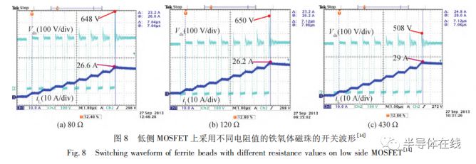 Wang 等展示了 transphorms 公司的 cascode 型GaN HEMT,包含一個(gè)低壓常關(guān)型的 Si FET 和一個(gè)高壓常開型的 GaN HEMT,結(jié) 構(gòu) 如 圖 7 所 示。在 低 側(cè)MOSFET 上采用不同電阻值的鐵氧體磁珠 ( 80 Ω、120 Ω和 430 Ω) 進(jìn)行比較,開關(guān)波形如圖 8 所示。