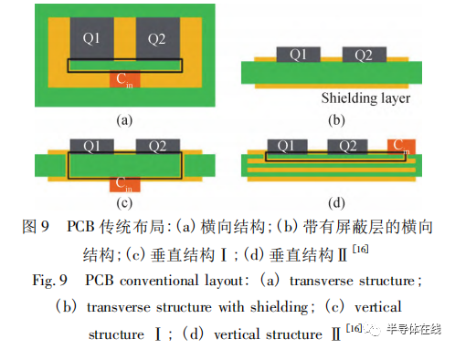 橫向結(jié)構(gòu)采用一個(gè)導(dǎo)電層,功率回路與導(dǎo)電層平行,如圖 9( a) 所示。通過(guò)增加屏蔽層,可以減小功率回路的電感,因?yàn)槠帘螌又械臏u流降低了磁通密度,如圖 9( b) 所示。垂直結(jié)構(gòu)中采用兩個(gè)導(dǎo)電層,功率回路垂直于導(dǎo)電層。垂直結(jié)構(gòu)有兩種常用結(jié)構(gòu),圖 9( c) 所示為一種垂直結(jié)構(gòu),其一側(cè)為開關(guān)器件,另一側(cè)為電容器。另一種垂直結(jié)構(gòu)在同一側(cè)有開關(guān)器件和輸入電容,該垂直結(jié)構(gòu)采用內(nèi)導(dǎo)電層,減小了功率回路的面積,減小了功率回路的電感,如圖 9( d) 所示。