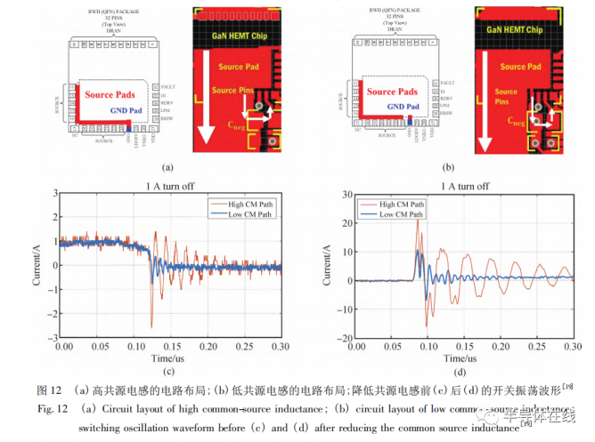 Abdullah 等提出一種直接驅(qū)動(dòng)系統(tǒng),簡(jiǎn)化了電路設(shè)計(jì),減少了外部元件的數(shù)量,并且具有較小的柵極回路寄生參數(shù)。同時(shí)研究了改進(jìn)開關(guān)瞬態(tài)特性的 PCB 布局優(yōu)化方法,他指出: 為了實(shí)現(xiàn)高性能和平滑的瞬態(tài)切換,在芯片周圍放置的無(wú)源元件必須優(yōu)化,內(nèi)部驅(qū)動(dòng)電路運(yùn)行所需的組件很少,重要的是要減少在器件開啟和關(guān)閉過(guò)程中引起電流振蕩的共源路徑。圖 12 為改進(jìn)前后的 PCB 布局。圖中 GND 引腳由內(nèi)部連接到源極,之間的 Cneg是必要的,因?yàn)榇寺窂缴系墓苍绰窂饺艉鲆?,則會(huì)引起柵極處的強(qiáng)烈振蕩??梢詮耐獠繉⑵浞蛛x,以避免電流耦合,如圖 12( b) 所示。對(duì)比降低共源電感前后的開關(guān)振蕩波形( 見圖 12( c) ) ,可以看出有明顯的優(yōu)化。通過(guò)更優(yōu)化的多層 PCB 板設(shè)計(jì)可以進(jìn)一步改進(jìn)。