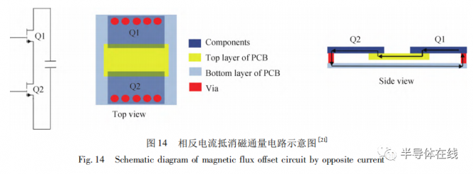 根據(jù) GaN System 應(yīng)用手冊(cè),當(dāng)兩個(gè)相鄰的導(dǎo)體靠近而電流方向相反時(shí),兩股電流產(chǎn)生的磁通量就會(huì)相互抵消,這種磁通抵消效應(yīng)可以降低寄生電感。因此 PCB 布局時(shí),使高頻電流在相鄰的兩個(gè) PCB 層上以相反的方向流動(dòng),可以減小寄生效應(yīng),如圖 14 所示。