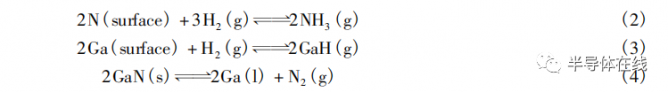 直接在 GaN 上生長(zhǎng)金剛石的問(wèn)題在于: CVD 金剛石工藝條件下 GaN 不夠穩(wěn)定,導(dǎo)致 GaN 薄膜被刻蝕。雖然 GaN 本身的熔點(diǎn)為 2 500 ℃左右,但 MPCVD 是利用 CH4 /H2氣體混合物高溫高壓下形成等離子體來(lái)沉積金剛石,GaN 與氫等離子體在 800 ℃條件下就會(huì)發(fā)生反應(yīng),GaN 固體本身也同時(shí)會(huì)發(fā)生分解現(xiàn)象。反應(yīng)方程式如下: