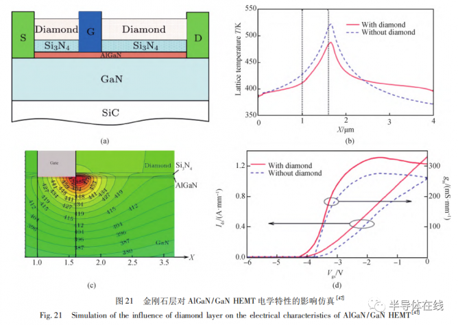 2. 3 金剛石與 GaN 間的界面熱阻 除了在 GaN 表面外延的金剛石質(zhì)量會(huì)影響散熱效率外,金剛石和氮化鎵材料間的界面熱阻( TBR) 也是一項(xiàng)重要的參數(shù)。 界面熱阻又稱邊界熱阻,出現(xiàn)在不同介質(zhì)之間的界面處,會(huì)阻礙熱流的傳輸。其定義為界面處的溫差與流過(guò)該界面的單位熱流之比。熱量會(huì)在微納結(jié)構(gòu)芯片和復(fù)合熱界面材料內(nèi)部的納米界面處發(fā)生大量的聲子散射,大幅阻礙熱流傳輸和擴(kuò)散,所以 TBR 對(duì)電子器件的散熱問(wèn)題起著至關(guān)重要的作用。 Yates 等分別測(cè)試了插入 5 nm 的氮化鋁和氮化硅及沒有插入層時(shí),氮化鎵和金剛石的 TBR 大小,利用時(shí)域熱反射和電子能量損失譜,發(fā)現(xiàn)在氮化硅插入層上外延金剛石所得到的 TBR 最低。這是由于在界面上形成的 Si-C-N 層避免了氮化鎵分解。無(wú)插入層和氮化鋁插入層的樣品由于界面粗糙度變大,增強(qiáng)了聲子散射,從而增大了 TBR。Sun 等結(jié)合瞬態(tài)熱反射測(cè)量、有限元建模和微觀結(jié)構(gòu)分析,發(fā)現(xiàn)金剛石與氮化鎵的TBR 主要與用于金剛石種晶的氮化硅插入層的厚度和成核層的質(zhì)量有關(guān)。插入層越薄,成核質(zhì)量越好,TBR 越小。Pomeroy 等將插入層厚度從 90 nm 降低到 50 nm,TBR 從 41 ( m2·K) /GW 降低到 17 ( m2·K) /GW。而 Cho 等采用 30 nm 的 SiN 層獲得了 29 ( m2·K) /GW 的 TBR,說(shuō)明金剛石成核層的質(zhì)量也是決定因素,單一地減小插入層的厚度無(wú)法最大限度地減小 TBR。 2. 4 金剛石蓋帽層散熱技術(shù) 由上所述,HEMT 自熱效應(yīng)主要由溝道 2DEG 產(chǎn)生,熱點(diǎn)靠近柵極偏漏極一側(cè)。所以,金剛石散熱層如果不作為襯底而是作為更加靠近溝道位置的蓋帽層,散熱效果會(huì)更加顯著。Zheng 等通過(guò)仿真研究了金剛石層對(duì) AlGaN/GaN HEMT 電學(xué)特性的影響,圖 21 為器件結(jié)構(gòu)及帶有金剛石層的 AlGaN/GaN HEMT 中晶格的溫度分布情況及金剛石層對(duì) HEMT 電學(xué)特性的影響。 可以看出,熱點(diǎn)位置仿真結(jié)果與理論分析一致,溫度峰值點(diǎn)從無(wú)金剛石層的 523 K 降到了 488 K。與常規(guī) HEMT 相比,帶有金剛石層的 HEMT 閾值電壓明顯減小,且跨導(dǎo)增加,這可能是由于在較低的晶格溫度下,借助于金剛石層,溝道電子遷移率增加。金剛石薄膜厚度在 1 μm 以下時(shí),fT隨著薄膜厚度增加的增長(zhǎng)迅速增大,薄膜厚度增加到 1 μm 以上后趨于飽和,由 24. 4 GHz 提高至 31. 5 GHz,提升了 29% ,因此金剛石層是提高器件高頻性能的一種有效手段。 Anderson 等實(shí)現(xiàn)了上述器件結(jié)構(gòu),測(cè)試得到溝道溫度下降 20% ,電學(xué)性能得到改善,導(dǎo)通電阻和擊穿電壓顯著提高,柵極漏電流減小。進(jìn)一步改進(jìn)直接在氮化鎵表面生長(zhǎng)沉積的工藝,鈍化效果與傳統(tǒng)的 SiNx鈍化器件效果一致。在此基礎(chǔ)上,Zhang 等用有限元方法研究了金剛石層對(duì)多指 HEMT 的影響。結(jié)果表明,金剛石層可以大大降低結(jié)溫,且近結(jié)區(qū)溫度變得更加均勻。金剛石層的散熱效率隨厚度的增加而增加,但增長(zhǎng)速率有減緩的趨勢(shì)。假定熱邊界電阻( TBRs) 為 1. 5 × 10 - 8 m2·K·W -1,柵長(zhǎng) 20 μm,柵極功率密度為 6 W/mm 的 12 指 GaN-on-Diamond HEMT,20 μm 的金剛石散熱層可以使結(jié)溫從 195. 8 ℃ 降低到172. 2 ℃。在 SiC 襯底上的 HEMT 的溫度降低更為顯著,可達(dá) 25. 3% 。Zhu 等首次通過(guò) Sentaurus TCAD模擬研究了金剛石層對(duì)雙通道 AlGaN/GaN HEMTs 的影響。結(jié)果表明,當(dāng)功耗增加到 46 W/mm 時(shí),金剛石層厚度為 1 μm 的雙通道 AlGaN/GaN HEMTs 的峰值溫度可降低 64 K,飽和漏極電流和跨導(dǎo)分別提高了0. 21 A/mm和 22 mS /mm,峰值 fT和 fmax分別提高了 4. 7 GHz 和 10. 3 GHz。