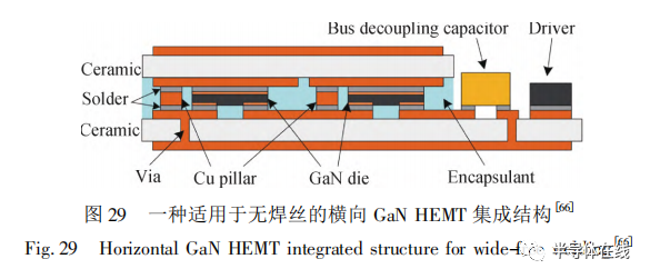 Li 等提出了一種適用于無(wú)焊絲的橫向 GaN HEMT 集成方案。采用雙面 DPC 基片和多銅層結(jié)構(gòu)。如圖 29 所示,氮化鎵芯片夾在兩 DPC 基板之間,以實(shí)現(xiàn)雙面冷卻。通過(guò)優(yōu)化布局,采用磁場(chǎng)抵消和屏蔽層技術(shù)進(jìn)一步降低寄生參數(shù)。由于增加了陶瓷基板,該結(jié)構(gòu)相比傳統(tǒng)鍵合線結(jié)構(gòu)可以承受更高且更少的熱機(jī)械應(yīng)力。以此制備的 650 V/30 A 功率模塊,與傳統(tǒng)單面散熱模塊相比熱阻降低 30% ~ 48% ,功率回路和柵回路電感降低到 0. 94 nH 和 2 nH,漏源電壓最大 dv/dt 可達(dá) 150 V/ns,功率密度為 820 W/in3,峰值功率達(dá)到98. 85% 。