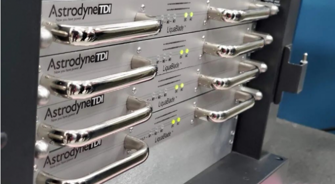 ▲ ATDI 1U 高 LiquaBlade? 功率模塊組件提供三個功率轉(zhuǎn)換通道,每個通道額定輸出功率為 5.5 kW,模塊總功率為 16.5 kW