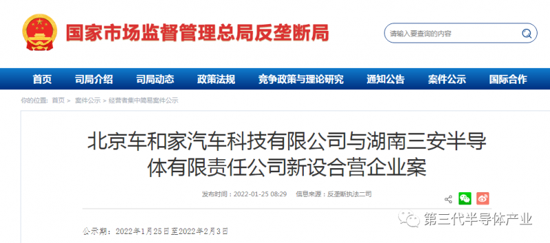 據(jù)了解,早在2月23日,國家市場監(jiān)督管理總局反壟斷局的經(jīng)營者集中簡易案件公示顯示,北京車和家汽車科技有限公司(簡稱:車和家)與湖南三安半導(dǎo)體有限責(zé)任公司(簡稱:三安半導(dǎo)體)將成立合營企業(yè)。