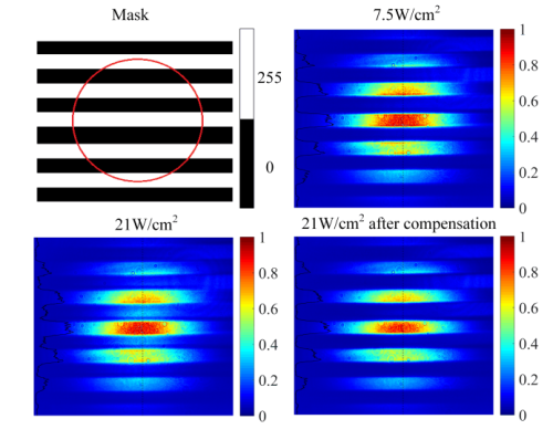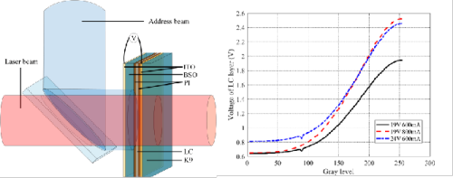 研究人員對(duì)OASLMs在高功率激光下的損傷機(jī)理和性能退化進(jìn)行了分析,并提出了一種性能退化的補(bǔ)償方法。OASLMs在激光輻照下的產(chǎn)生熱量主要沉積在導(dǎo)電膜層-ITO和光電導(dǎo)層-硅酸鉍(BSO)的位置,從而引起液晶的溫升,使其有效雙折射率發(fā)生改變,最終導(dǎo)致OASLMs的對(duì)光束的調(diào)控能力降低。通過(guò)適當(dāng)?shù)慕档蚈ASLMs的驅(qū)動(dòng)電壓,同時(shí)提升其寫入光的電流,液晶層的分壓在低灰階和高灰階下均能保持在最佳范圍內(nèi),可有效的補(bǔ)償OASLMs因溫升引起的性能退化。通過(guò)這種補(bǔ)償方式可以使OASLMs在連續(xù)激光下的損傷閾值從7.5W/cm2提升至20W/cm2,同時(shí)仍保持較好的光束調(diào)控能力,開關(guān)比大于100:1,透過(guò)率高于85%。