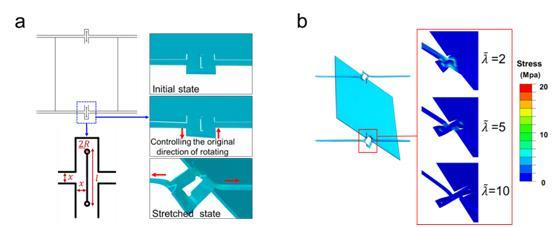 鉸鏈幾何尺寸和器件區(qū)的形狀設計靈活,可根據(jù)具體應用場景選用不同的幾何參數(shù)和平面形狀,最大轉(zhuǎn)動角度與特征長度l/x相關(圖3a)。有限元計算展示了剪紙結(jié)構在拉伸狀態(tài)下不同區(qū)域的應力分布狀態(tài):應力只集中在微鉸鏈區(qū),而器件區(qū)無應力分布,這保證了器件所在區(qū)域的力學穩(wěn)定性(圖3b)。