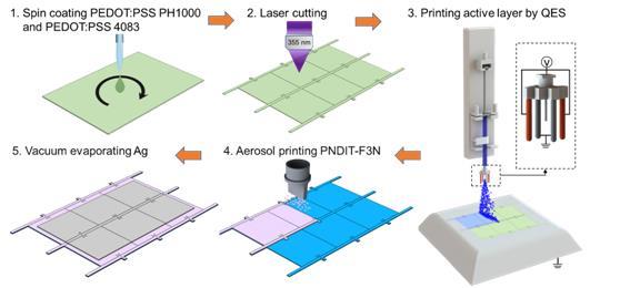 OPV器件在具有剪紙切口的柔性基底上成膜,考慮到基底的柔性、避免切割過程造成器件污染和材料浪費等因素,采用靜電噴霧來制備OPV活性層薄膜(圖2)。靜電噴霧可以產(chǎn)生單分散、亞微米級、定向性好的液滴,適合非接觸式打印納米級厚度的薄膜。