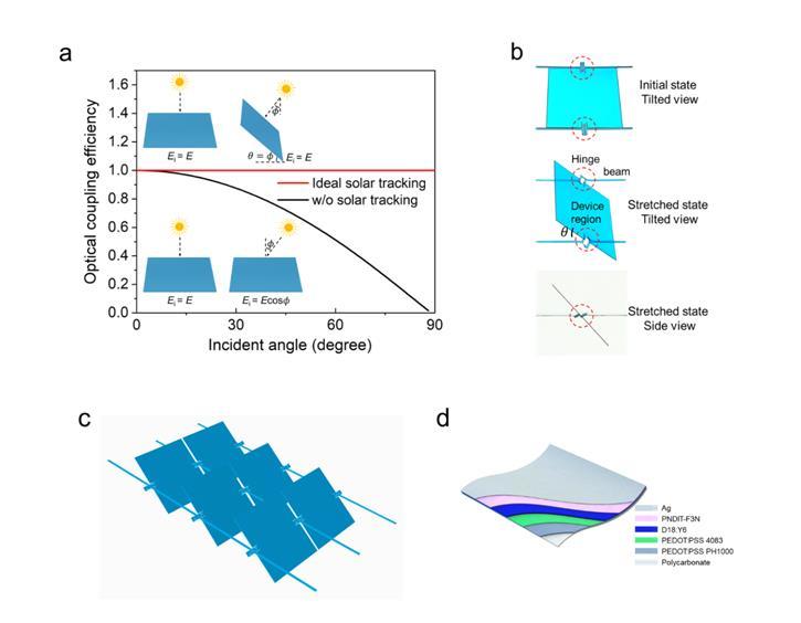 有機太陽能電池(Organic Photovoltaics, OPV)具有輕、薄、柔性的優(yōu)勢,可以開發(fā)出傳統(tǒng)光伏技術難以實現(xiàn)的新技術,拓展在柔性電子領域的應用。在真實應用場景中,一天內(nèi)和不同季節(jié),日照角度會有所變化,在陽光非垂直入射的情況下,投影面積減小,會造成光伏電池表面輻射照度減小,從而造成光吸收能量的損失(圖1a)。通過光線追蹤,使光伏電池表面隨著光源入射角度的變化而轉(zhuǎn)動,可以保持光線正入射到光伏電池表面。然而傳統(tǒng)光線追蹤方法依靠機械運動機構,不適用于薄膜電池。剪紙可以把平面的紙變化為形態(tài)各異的立體結(jié)構,這其中蘊含了數(shù)學思想和工程力學原理。鄧巍巍教授課題組設計了一種類似百葉窗的鉸鏈剪紙結(jié)構,并首次應用于有機光伏電池的光追蹤。剪紙結(jié)構由H-kirigami由鉸鏈 (hinge)、拉伸桿 (beam) 和器件區(qū) (device region)組成,三部分承擔不同角色(圖1b)。在拉伸桿受單軸拉伸力時微鉸鏈發(fā)生面外屈曲形變,帶動器件區(qū)轉(zhuǎn)動,實現(xiàn)光伏電池的光追蹤(圖1c)。有機光伏電池結(jié)構為Polycarbonate/PH1000/PEDOT:PSS4083/D18:Y6/PNDIT-F3N/Ag(圖1d)。