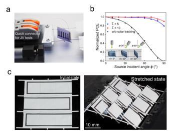通過拉伸轉(zhuǎn)動剪紙OPV器件對進行光線追蹤的測試表明(圖4a),隨著特征長度的增大,器件的最大轉(zhuǎn)向角增大,最大應力減小,當拉桿寬度為1 mm、特征長度為10的情況下,最大追蹤角可以達到75°,考慮到建筑物和山體遮擋,這已經(jīng)滿足了絕大部分應用場景的光追蹤需求。柔性剪紙OPV器件光電轉(zhuǎn)換效率達到14.15%,而且在最大光追蹤角度下,光耦合效率仍接近100%(圖4b)。經(jīng)過了20000次循環(huán)拉伸后,器件效率保持不變。該研究還設計制備了大面積剪紙OPV器件陣列,通過拉伸桿實現(xiàn)各個器件區(qū)域的連接(圖4c)。0.6 cm2柔性剪紙有機光伏電池陣列實現(xiàn)了超過10%的光電轉(zhuǎn)換效率。