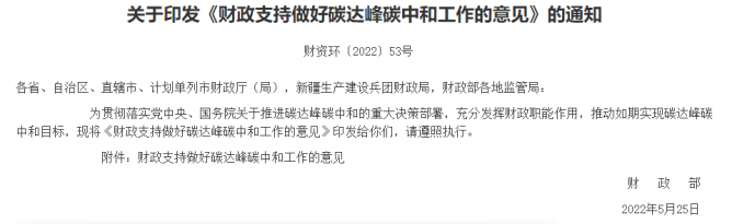 5月30日,財(cái)政部發(fā)布關(guān)于印發(fā)《財(cái)政支持做好碳達(dá)峰碳中和工作的意見(jiàn)》的通知,《意見(jiàn)》明確六大支持重點(diǎn)方向和領(lǐng)域,包括支持構(gòu)建清潔低碳安全高效的能源體系、支持重點(diǎn)行業(yè)領(lǐng)域綠色低碳轉(zhuǎn)型、支持綠色低碳科技創(chuàng)新和基礎(chǔ)能力建設(shè)、支持綠色低碳生活和資源節(jié)約利用、支持碳匯能力鞏固提升、支持完善綠色低碳市場(chǎng)體系。