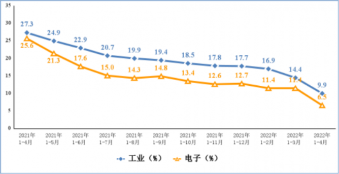 據(jù)工信部消息,1-4月份,我國電子信息制造業(yè)增加值和出口交貨值增速下滑,企業(yè)經(jīng)營效益承壓,投資保持快速增長。