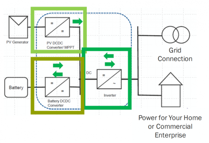 圖1 為一個(gè)典型的 ESS 架構(gòu),包含了電源(光伏 PV,值得注意的是, 這個(gè)應(yīng)用可以使用任何替代能源替換), DC/DC 轉(zhuǎn)換器,電池充電機(jī),把能量輸送到家庭端或輸送回電網(wǎng)的逆變器。這種配置下的三個(gè)電源模塊中,SiC 可以提高效率,減少尺寸、重量和成本。