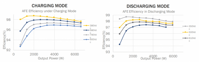 在測試、測量各種負(fù)載下的效率和單相充電的電壓范圍時(shí),結(jié)果表明,SiC 的效率高達(dá) 98.5%,而 IGBT 的最高效率為 96%, 因此 SiC 的損耗降低約 38%。圖 4 顯示了在不同功率水平下充電和放電的 AFE 的兩組圖表。