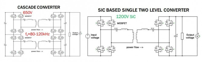 很多拓?fù)渲С指綦x型 DC/DC 轉(zhuǎn)換器。然而,最主流的解決方案是半橋 LLC 和全橋 LLC 轉(zhuǎn)換器。參考設(shè)計(jì)(Wolfspeed 的 CRD-22DD12N)展示了一種 22 kW 的解決方案,可配置在級(jí)聯(lián)變換器或單個(gè)兩級(jí)變換器。級(jí)聯(lián)變換器可以使用 650V Si MOSFET 或 SiC 器件,但通常會(huì)需要更多數(shù)量的部件,更高的導(dǎo)通損耗,更復(fù)雜的控制,以及更高的系統(tǒng)成本。使用 SiC 器件的單級(jí)兩電平變換器可在更高的電壓(1200 V)和高達(dá) 200 kHz 的開關(guān)頻率下工作。SiC 基的最大優(yōu)勢是更高的效率/更低的損耗,并具有一些額外的特性,如零電壓導(dǎo)通、低電流關(guān)斷和更低的電磁干擾 EMI 風(fēng)險(xiǎn)。這種拓?fù)浣Y(jié)構(gòu)比級(jí)聯(lián)變換器的部件數(shù)更少,有助于降低系統(tǒng)成本,提供更簡單的控制。圖 5 展示了這兩種拓?fù)涞牟町悺?/div>