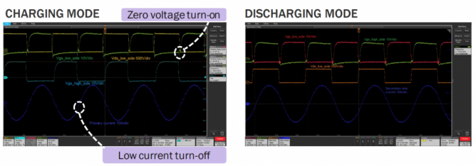 圖 6 顯示了全橋配置的充電和放電模式的波形。充電模式圖顯示零電壓導(dǎo)通,低電流關(guān)斷,運(yùn)行效率高。波形也非常干凈,有低過沖開關(guān),有助于消除 EMI 問題。