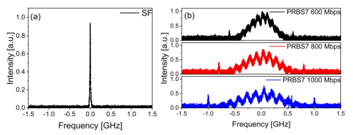圖2 1178 nm激光光譜(a)不加調(diào)制,(b)加載PRBS7位相調(diào)制,比特率分別為600 Mbps、800 Mbps和1000 Mbps。