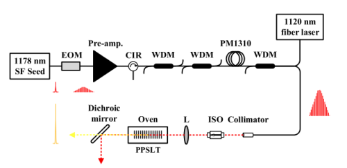 此前,該研究團隊通過對拉曼光纖施加三十級梯度應力來抑制單頻激光放大器中的受激布里淵散射,采用八字環(huán)形腔結(jié)構(gòu)的諧振倍頻方式獲得50 W 單頻589 nm激光。與之相比,該研究中采用基于位相調(diào)制-自解調(diào)的技術(shù)方案,大大簡化了鈉導星裝置的復雜程度,提升了其可靠性,結(jié)合拉曼波長靈活的特點,可以進一步拓展,獲得其它波長的單頻激光。
