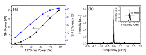 圖3 (a)倍頻光功率及轉(zhuǎn)換效率隨1178 nm激光功率的變化曲線,(b)輸出功率最高時對應的倍頻光光譜圖(20 W)。插圖為輸出激光的精細光譜。