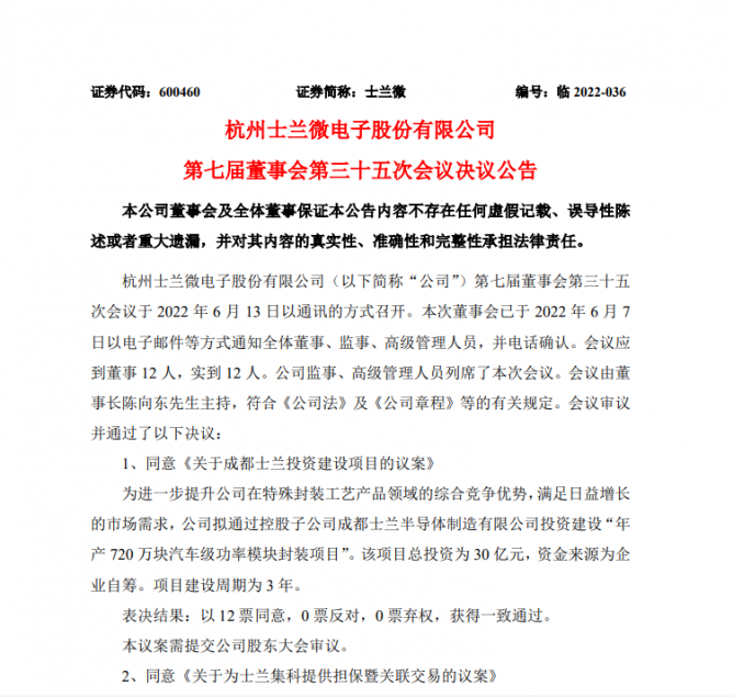 半導(dǎo)體產(chǎn)業(yè)網(wǎng)訊:6月14日,士蘭微發(fā)布董事會(huì)決議公告稱,通過(guò)《關(guān)于成都士蘭投資建設(shè)項(xiàng)目的議案》,指出為進(jìn)一步提升公司在特殊封裝工藝產(chǎn)品領(lǐng)域的綜合競(jìng)爭(zhēng)優(yōu)勢(shì),滿足日益增長(zhǎng)的市場(chǎng)需求,公司擬通過(guò)控股子公司成都士蘭半導(dǎo)體制造有限公司投資建設(shè)“年產(chǎn)720萬(wàn)塊汽車級(jí)功率模塊封裝項(xiàng)目”。該項(xiàng)目總投資為30億元,資金來(lái)源為企業(yè)自籌。項(xiàng)目建設(shè)周期為3年。