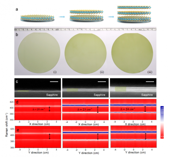 以二硫化鉬為代表的二維半導(dǎo)體材料是一類戰(zhàn)略新材料,有望解決當前晶體管微縮瓶頸,構(gòu)筑出速度更快、功耗更低、柔性透明的新型半導(dǎo)體芯片。而且,與單層相比,多層二硫化鉬更有助于提升器件性能。但是,由于熱動力學(xué)的基本限制,如何實現(xiàn)高品質(zhì)多層二硫化鉬晶圓的制備仍是一個巨大挑戰(zhàn)。