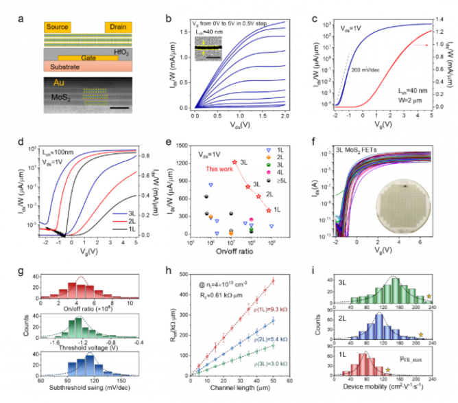 基于單層、雙層及三層二硫化鉬晶圓,他們加工了長溝道和短溝道的場效應(yīng)晶體管器件,并表征了器件的性能。電學(xué)測量結(jié)果表明:100納米溝長的晶體管在驅(qū)動電壓Vds=1V時的開態(tài)電流密度從單層的0.4 mA·μm-1提高到雙層的0.64 mA·μm-1和三層的0.81 mA·μm-1,分別提高了60%和102.5%;40納米溝長的三層二硫化鉬短溝道器件在Vds=2/1/0.65 V時的開態(tài)電流密度達到1.70/1.22/0.94 mA·μm-1的電流密度,為已報道的最高值,且具有超過107的開關(guān)比,優(yōu)于國際器件與系統(tǒng)路線圖(IRDS) 中高性能邏輯器件的2024年目標。