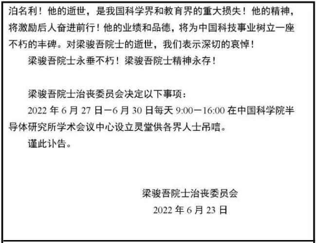 半導(dǎo)體產(chǎn)業(yè)網(wǎng)獲悉:6月24日,中科院半導(dǎo)體所發(fā)布訃告:中國工程院院士、中國科學(xué)院半導(dǎo)體研究所研究員、我國著名半導(dǎo)體材料學(xué)家梁駿吾先生因病醫(yī)治無效,不幸于2022年6月23日17時在北京逝世,享年89歲。