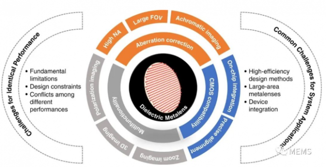 因此,介質(zhì)超構(gòu)透鏡在成像和光學信息處理中得到了探索,逐漸顯示出取代傳統(tǒng)級聯(lián)透鏡的潛力。然而,超構(gòu)透鏡集成系統(tǒng)進一步應用所面臨的特殊挑戰(zhàn)還有待解決。