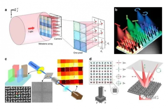 為了提高整體效率,優(yōu)選由高折射率和低損耗材料組成的全介質(zhì)超構(gòu)透鏡。隨著超構(gòu)光學元件的快速發(fā)展,與傳統(tǒng)折射透鏡相比,介質(zhì)超構(gòu)透鏡展示了以下優(yōu)勢:(i)單色和色差校正都可以通過單層或幾層納米結(jié)構(gòu)實現(xiàn),盡管需要處理透鏡參數(shù)之間的沖突(例如,用于校正多個像差,數(shù)值孔徑(NA)和視場(FoV)之間的權(quán)衡)。(ii)由于波前成形具有高自由度,通過單個超構(gòu)透鏡可以同時實現(xiàn)多種功能,為構(gòu)建各種誘人的光學元件開辟了新時代。例如,由一個超構(gòu)透鏡和一個圖像傳感器組成的single-shot偏振相機,相應的傳統(tǒng)焦平面系統(tǒng)則需要由分束器、偏振器、波片、級聯(lián)透鏡和多個探測器組成。(iii)超構(gòu)透鏡的制造與微電子產(chǎn)業(yè)的CMOS制造工藝兼容。因此,超構(gòu)透鏡有潛力直接與圖像傳感器集成,而半導體代工廠的成熟技術(shù)可以實現(xiàn)元件的精確對準。