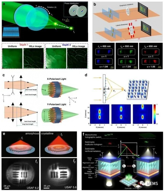 不過,傳統(tǒng)透鏡的光聚焦依賴累積傳播相位,由于天然材料的折射率限制,足夠的累積相位具有挑戰(zhàn)性,因此很難進一步縮小尺寸。此外,為了獲得高成像質(zhì)量,通常需要級聯(lián)透鏡,這會帶來龐大的結(jié)構(gòu)和精確對準方面的挑戰(zhàn)。衍射透鏡依賴由空間排列“區(qū)域”操縱的透射光的相長干涉,已被提出作為一種平面光學透鏡。然而,它們往往受到低效率、高色散、陰影效應和集成困難的阻礙。此外,單個衍射透鏡難以取代多個折射透鏡。