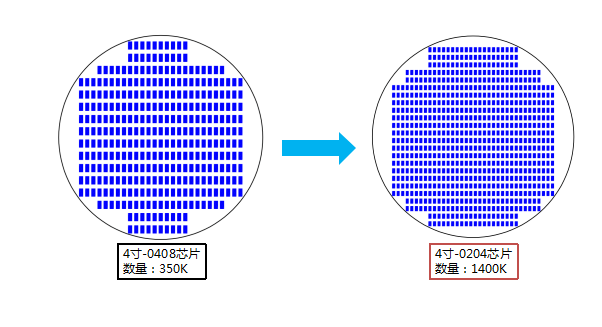 經對比,單片4寸晶圓可以生產約350K數(shù)量的0408(4mil*8mil)芯片,當芯片面積尺寸縮小至0204(2mil*4mil)時,同樣的晶圓面積下大約可產出1400K數(shù)量的芯片,這使得單個芯片成本下降60%以上。