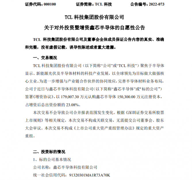 半導體產業(yè)網(wǎng)訊,7月7日,TCL科技發(fā)布公告,為進一步增強與產業(yè)鏈合作伙伴的協(xié)同效應,完善半導體材料業(yè)務布局,公司于近日與鑫芯半導體科技有限公司(“鑫芯半導體”)簽署《增資協(xié)議》,以17.9億元認購鑫芯半導體15.03億元注冊資本,占增資后總出資份額的23.08%。