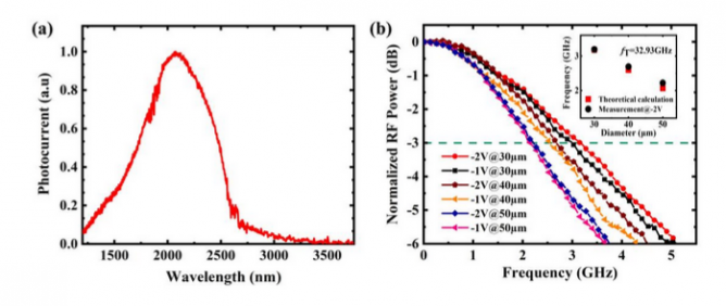 圖1:鍺錫探測器的(a)光響應(yīng)譜;(b)頻率響應(yīng)譜