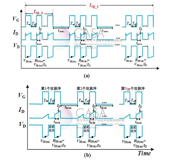 圖 硬開關(guān)切換過(guò)程中動(dòng)態(tài)導(dǎo)通電阻連續(xù)脈沖測(cè)試波形圖(a)和雙脈沖測(cè)試波形圖(b)