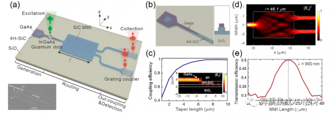 圖1. (a) 在4H-SiCOI材料平臺上設(shè)計的1×2 MMI器件示意圖。在MMI器件的輸入波導(dǎo)上集成了一個錐形GaAs納米光子波導(dǎo)。兩個輸出端口端分別制備垂直光柵耦合器,左下插圖為該結(jié)構(gòu)的SEM圖像;(b) 雙層波導(dǎo)耦合器的結(jié)構(gòu)示意圖;(c) 波導(dǎo)耦合器的耦合效率隨錐形長度的變化,插圖顯示了從頂部GaAs波導(dǎo)到下方4H-SiC波導(dǎo)的基本TE模場轉(zhuǎn)移;(d) MMI器件中的電場強度分布;(e) MMI器件輸出端口傳輸效率與器件耦合長度的變化關(guān)系。